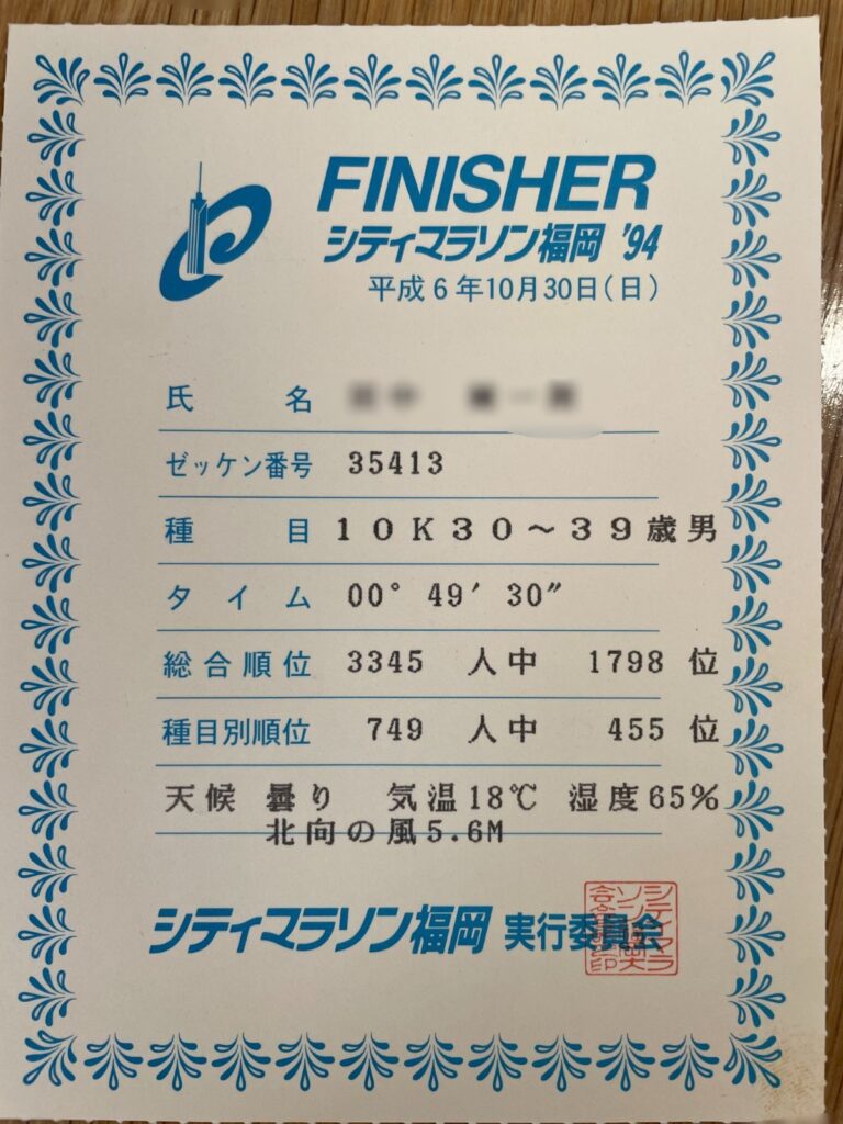 ずいぶん前のランニング記録が出てきた。10㎞を50分切っている!全く考えずに走って、キロ5分、俺でもこんな時があったのか!感慨深い。この時32歳、このころからフルマラソンに真剣に取り組んでいれば・・・今頃は・・・。過ぎ去った日々を後悔。
