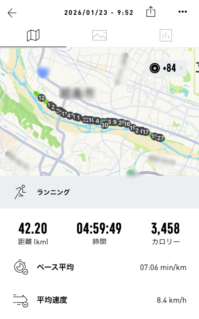 39㎞で最後の補給、残り3㎞だがこれがとても長いし辛い、足が完全に重い。残り500m、5時間切りがギリギリ、もう必死に足掻く感じ、呼吸は練習ではやったことが無い1ビート、スマホを見ながら42.2㎞になったところで即アプリの終了ボタンを押す、やった!