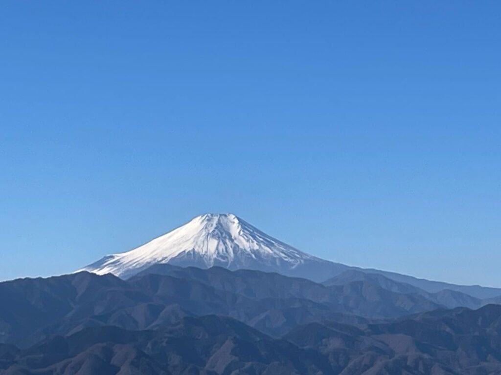 快晴の空の下、黒々とした山並みの向こうに、真白い富士山が雄大にそびえて、ブラボー!