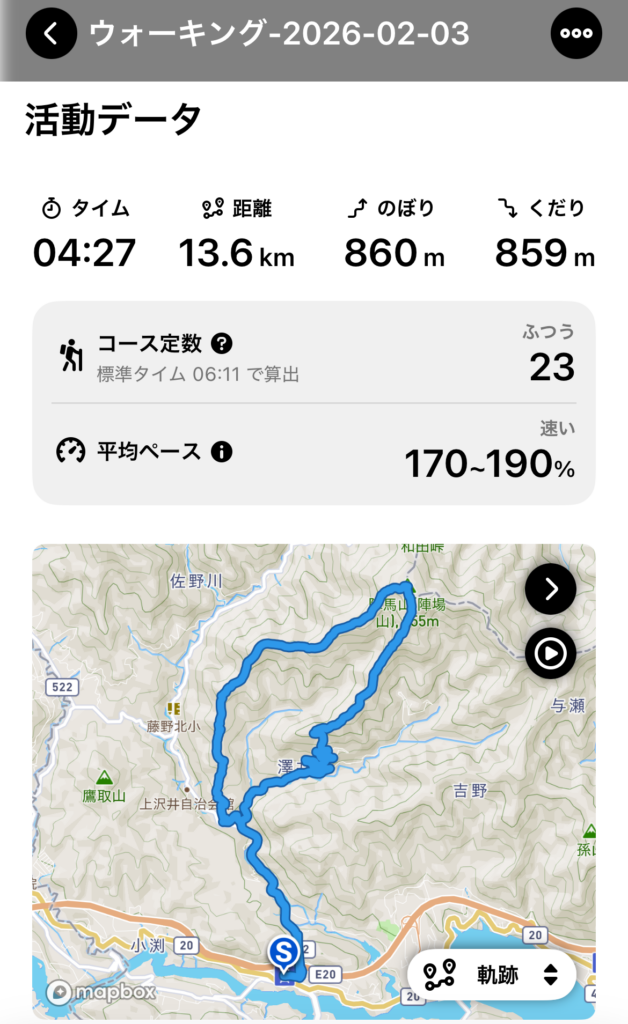 予定通り縦走なら8時間23㎞。でも、4日前に42㎞走しているのでちょっと無謀だったかも。今日はこれで良しとしよう